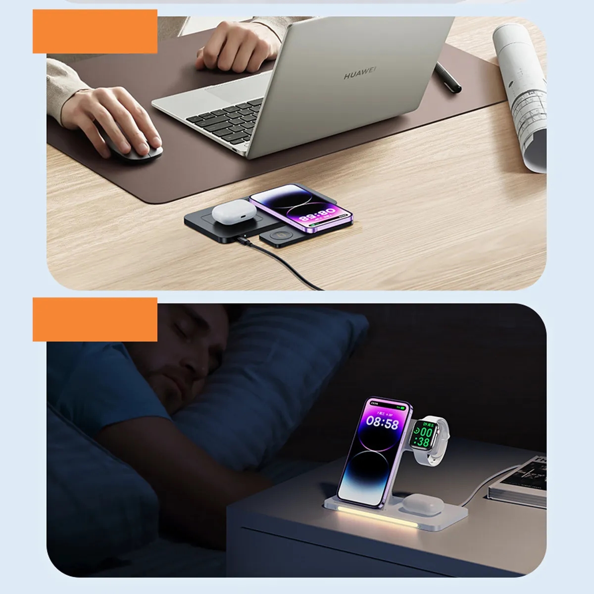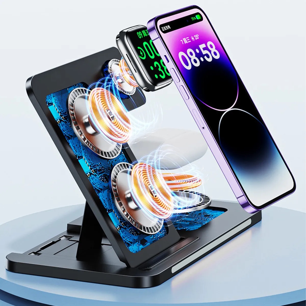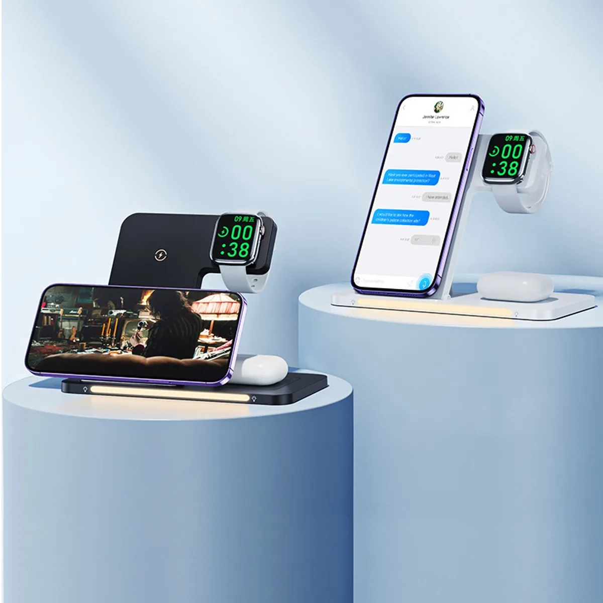 Additional InformationMulti - device wireless charging station for phone, earbuds, and smartwatch, with integrated ambient lighting.