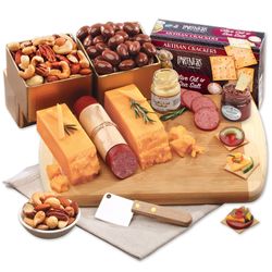 Our best-selling cheese package! When they open this gift, the party will begin! Our elegant sustainable Bamboo cutting board with your imprint, of course, comes packed with all the necessary ingredients for a charcuterie spread at home or at work, including seven-ounce blocks of naturally-aged Private Stock Wisconsin cheddars. Serves 12-16.